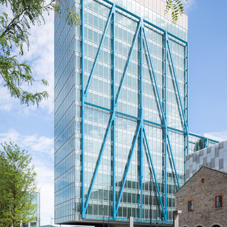 The landmark EXO building by Shay Cleary Architects is the tallest commercial office building in Ireland. A unique engineering challenge, the building features a distinctive and highly innovative external exo-skeleton which forms the main structure, leaving a predominantly column free floor plate and referencing the iconic blue gantries of the Dublin docklands. The building features an extensive 1,000m2 landscaped roof garden to which all tenants have access.
